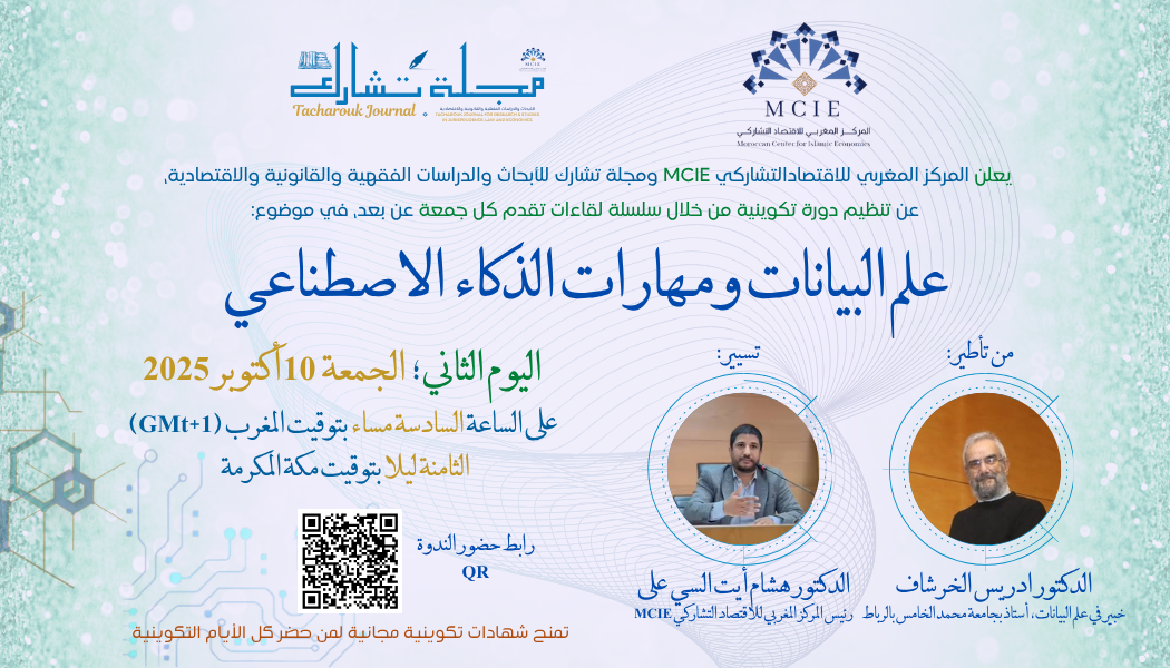 ليوم الثاني من الدورة التكوينية حول موضوع: علم البيانات ومهارات الذكاء الاصطناعيمن تأطير: الدكتور ادريس الخرشاف؛ خبير في علم البيانات، أستاذ بجامعة محمد الخامس بالرباطوذلك يوم: الجمعة 26 شتنبر 2025. (اليوم الأول)على الساعة:- السادسة مساء بتوقيت المغرب (GMT+1). -الثامنة ليلا بتوقيت مكة المكرمة رابط الحضور والتسجيل: