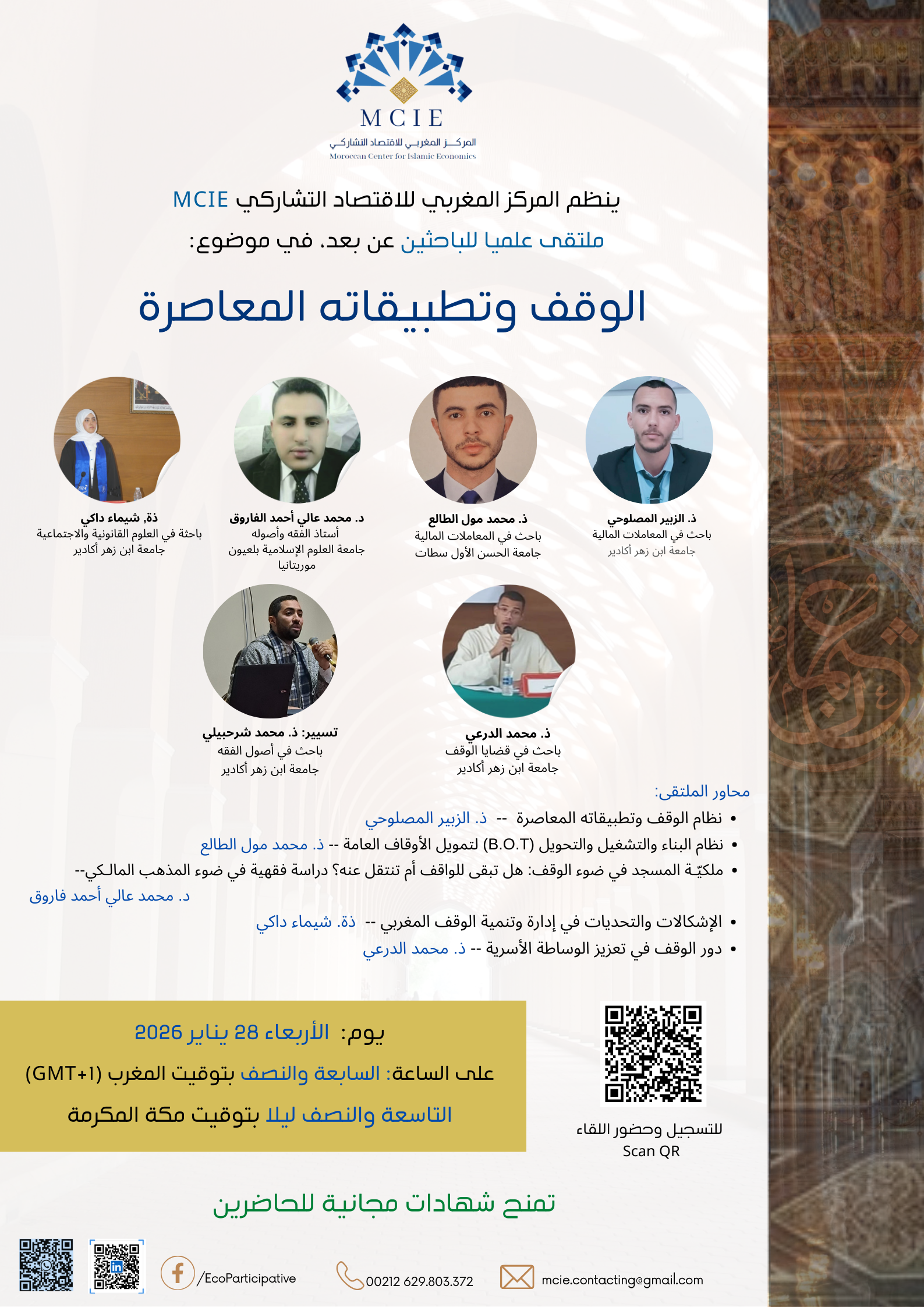 ينظم المركز المغربي للاقتصاد التشاركي MCIE ملتقى علميا للباحثين عن بعد، في موضوع: